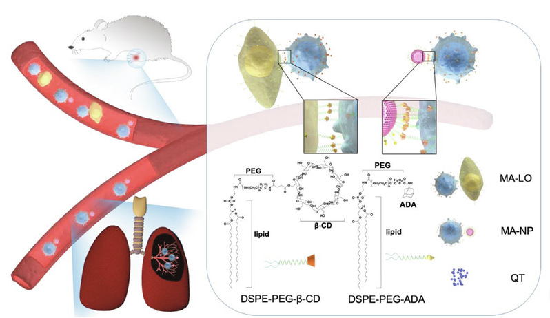 Cells possess inherent advantages to facilitate targeted payload delivery. Current strategies to conjugate payload carriers to the surface of cells are either via covalent bonds that not only involve complicated synthetic process but also often impair cellular functions, or via biological ligand-receptor interactions that are only specific to particular types of cells. Herein, we report a facile, bioorthogonal supramolecular conjugation strategy to prepare targeted cell-hitchhiking delivery systems, mediated via artificial host–guest interactions between β-cyclodextrin and adamantane, respectively anchored (via insertion) on the surfaces of live cells and payload carriers. In a paw swelling inflammation mouse model, supramolecularly conjugated macrophage-carriers (either cell–cell or cell-nanoparticle systems) were efficiently delivered hand-in-hand to the swelling paw, driven by the inflammatory tropism of macrophage. Furthermore, in an acute lung inflammation model of mouse, supramolecular conjugation of peritoneal macrophage and quercetin-loaded liposomes significantly improved targeting efficiency of the liposomes, and effectively alleviated the lung inflammation through the anti-inflammatory and anti-oxidative effects of quercetin. The cell-friendly, facile, host–guest interactions mediated cellular conjugation may provide the very first general strategy for preparing various cell-hitchhiking delivery systems to meet the needs of diverse biomedical applications.