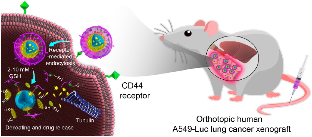 PLGA-based nanomedicines have enormous potential for targeted cancer therapy. To boost their stability, targetability, and intracellular drug release, here we developed novel multifunctional PLGA anticancer nanomedicines by combining a reductively cleavable surfactant (RCS), vitamin E−SS−oligo(methyl diglycol L-glutamate), with covalent hyaluronic acid (HA) coating. Reduction-sensitive HA-coated PLGA nanoparticles (rHPNPs) were obtained with small sizes of 55−61 nm and ζ potentials of −26.7 to −28.8 mV at 18.4−40.3 wt % RSC. rHPNPs were stable against dilution and 10% FBS while destabilized under reductive condition. The release studies revealed significantly accelerated docetaxel (DTX) release in the presence of 10 mM glutathione. DTX−rHPNPs exhibited potent and specific antitumor effect to CD44 + A549 lung cancer cells (IC50 = 0.52 μg DTX equiv/mL). The in vivo studies demonstrated that DTX−rHPNPs had an extended circulation time and greatly enhanced tolerance in mice. Strikingly, DTX−rHPNPs completely inhibited growth of orthotopic human A549-Luc lung tumor in mice, leading to a significantly improved survival rate and reduced adverse effect as compared to free DTX. This study highlights that advanced nanomedicines can be rationally designed by combining functional surfactants and surface coating.