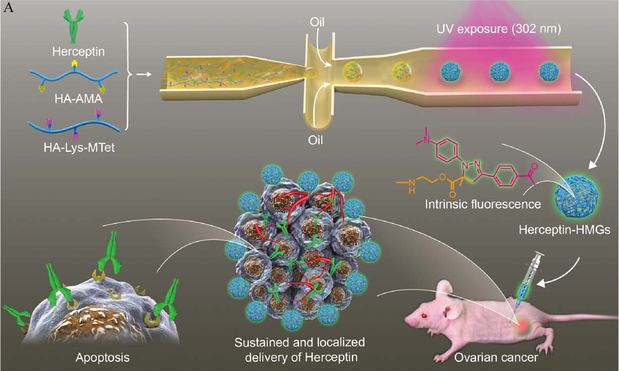 Antibody therapeutics, though representing a most used biomedicine, suffers from poor in vivo stability, rapid degradation, and frequent injections. Here, we report that fluorescent hyaluronic acid microgels (HMGs) tailor-made by combining microfluidics and “tetrazole−alkene” photoclick chemistry enable sustained and localized delivery of Herceptin in ovarian tumors. HMGs were obtained with a defined size (25−50 μm), narrow size distribution, high stability, and strong green fluorescence. Notably, HMGs exhibited a remarkably high loading of proteins such as Herceptin and IgG with a loading efficiency exceeding 90% at a theoretical protein-loading content of 30 wt %. In vitro protein release experiments revealed a sustained and hyaluronidase (HAase)-dependent release of Herceptin from HMGs, in which 80.6% of Herceptin was released at 1 U/mL HAase in 10 days. The released Herceptin maintained its secondary structure and antitumor activity. In vivo imaging results demonstrated obviously better tumoral retention for Cy5-labeled Herceptin-loaded HMGs following subcutaneous (sc) injection than for the free-protein counterpart. Interestingly, sc injection of the Herceptinloaded HMGs into SKOV-3 human ovarian tumor-bearing nude mice at a dose of 30 mg Herceptin equiv/kg induced nearly complete tumor suppression, which was significantly more effective than the sc or systemic injection of free Herceptin. These tailor-made fluorescent HMGs appeared as a robust injectable platform for sustained and localized delivery of therapeutic proteins.