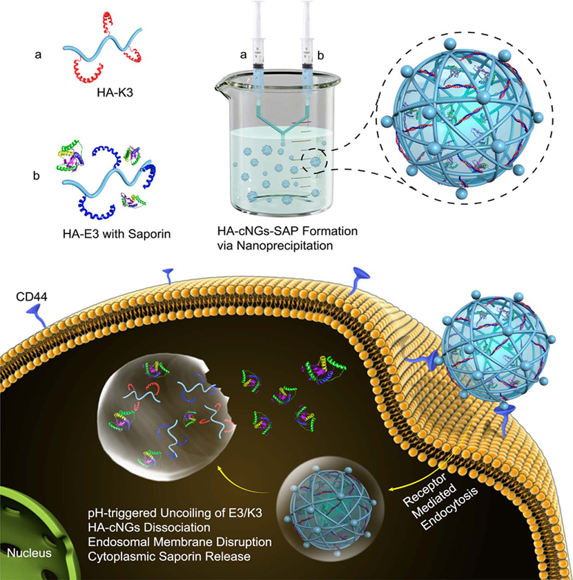 The clinical translation of protein drugs that act intracellularly is limited by the absence of safe and efficient intracellular protein delivery vehicles. Here, pH-sensitive coiled-coil peptide-cross-linked hyaluronic acid nanogels (HA-cNGs) were designed and investigated for targeted intracellular protein delivery to CD44 overexpressing MCF-7 breast cancer cells. HA-cNGs were obtained with a small size of 176 nm from an equivalent mixture of hyaluronic acid conjugates with GY(EIAALEK)3GC (E3) and GY-(KIAALKE)3GC (K3) peptides, respectively, at pH 7.4 by nanoprecipitation. Circular dichroism (CD) proved the formation of coiled-coil structures between E3 and K3 peptides at pH 7.4 while fast uncoiling at pH 5.0. HA-cNGs showed facile loading of cytochrome C (CC) and greatly accelerated CC release under mild acidic conditions (18.4%, 76.8%, and 91.4% protein release in 24 h at pH 7.4, 6.0, and 5.0, respectively). Confocal microscopy and flow cytometry displayed efficient internalization of CC-loaded HA-cNGs and effective endosomal escape of CC in MCF-7 cancer cells. Remarkably, HA-cNGs loaded with saporin, a ribosome inactivating protein, exhibited significantly enhanced apoptotic activity to MCF-7 cells with a low IC50 of 12.2 nM. These coiled-coil peptide-cross-linked hyaluronic acid nanogels have appeared as a simple and multifunctional platform for efficient intracellular protein delivery.