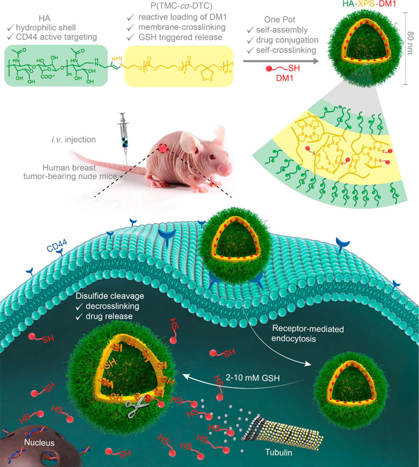 Y. Zhang, K.Q. Wu, H.L. Sun*, J. Zhang, J.D. Yuan, and Z.Y. Zhong*, Hyaluronic acid-shelled disulfide-crosslinked nano-polymersomes for ultrahigh-efficiency reactive encapsulation and CD44-targeted delivery of mertansine toxin, ACS Appl. Mater. Interfaces 2018, 10, 1597-1604.