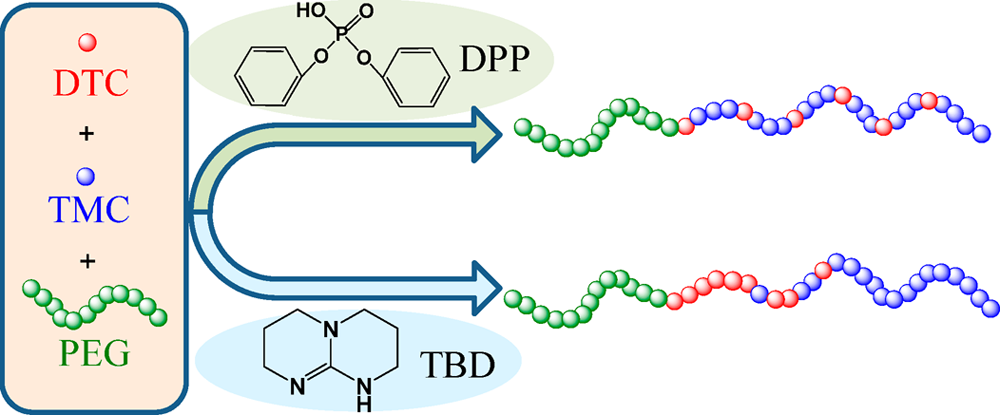 The ring opening copolymerization of trimethylene carbonate (TMC) and dithiolane trimethylene carbonate (DTC) using acidic and basic organocatalysts, i.e., diphenyl phosphate (DPP) and triazabicyclo[4.4.0]dec-5-ene (TBD), was systemically investigated. Interestingly, DPP and TBD gave rise to completely different polymerization kinetics and copolymer sequences. The copolymerization of TMC and DTC using methoxy poly(ethylene glycol) (mPEG−OH) as an initiator and DPP as a catalyst proceeded in a first-order manner and to near completion in 72 h for both monomers, yielding well-controlled copolymers with random sequences, predictable molar mass, and low dispersity (Mw/Mn = 1.09−1.19). By contrast, TBD brought about much faster copolymerization of TMC and DTC under similar conditions (high monomer conversion achieved in 2−4 h), to furnish copolymers with controlled molar mass and moderate dispersity (Mw/Mn = 1.27−1.80). Moreover, polymerization kinetics revealed that DTC was preferentially polymerized followed by first-order polymerization of TMC, leading to blocky copolymers. These results signify that type of organocatalysts has a critical influence on polymerization kinetics of cyclic carbonates, copolymer sequence, and molar mass control.