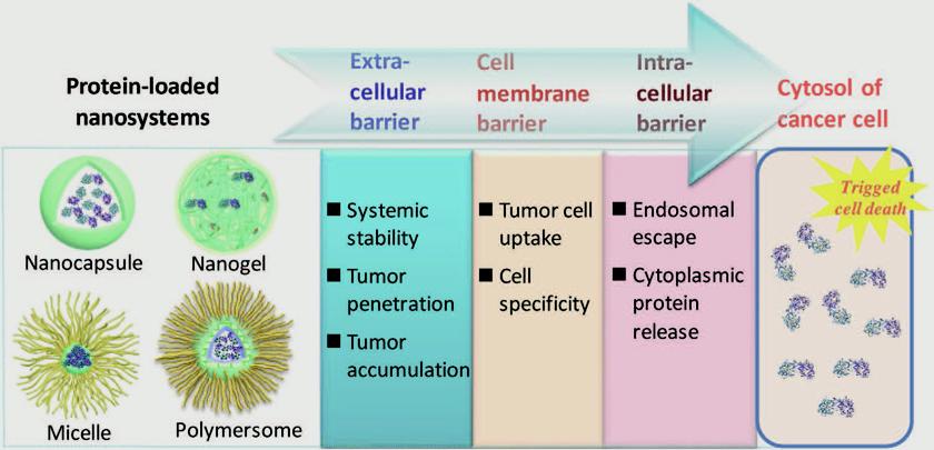 Protein drugs are a unique and versatile class of biotherapeutics that have not only high biological activity but also superb specificity. This rapidly evolving biotechnology has rendered it possible to produce various proteins in a large scale and reproducible way. Many proteins have demonstrated striking anticancer activities and have emerged as advanced alternatives to cytotoxic chemotherapeutic agents for cancer therapy. The clinical translation of anticancer proteins with intracellular targets is, nevertheless, severely hindered by their fast degradation in vivo, poor cell penetration, and inefficient intracellular transportation. The past few years have witnessed tremendous effort and progress in developing polymeric protein delivery nanosystems, ranging from nanoparticles, nanocapsules, nanogels, micelles, to polymersomes, for the treatment of different tumors such as lung tumors, breast tumors, ovarian cancers, and glioblastoma. These proof-of-concept studies point out that protein nanotherapeutics, with rationally designed nanovehicles, are able to overcome the extracellular barriers, cell membrane barriers, and intracellular barriers, and systemically deliver proteins into targeted cancer cells, resulting in effective cancer protein therapy. Protein nanotherapeutics appear to be a novel modality for safe and efficient cancer treatment.