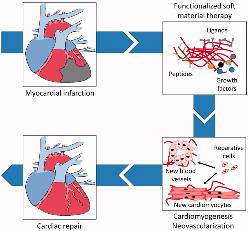 Coronary artery disease is a leading cause of death in developed nations. As the disease progresses, myocardial infarction can occur leaving areas of dead tissue in the heart. To compensate, the body initiates its own repair/regenerative response in an attempt to restore function to the heart. These efforts serve as inspiration to researchers who attempt to capitalize on the natural regenerative processes to further augment repair. Thus far, researchers are exploiting these repair mechanisms in the functionalization of soft materials using a variety of growth factor-, ligand- and peptide-incorporating approaches. The goal of functionalizing soft materials is to best promote and direct the regenerative responses that are needed to restore the heart. This review summarizes the opportunities for the use of functionalized soft materials for cardiac repair and regeneration, and some of the different strategies being developed.