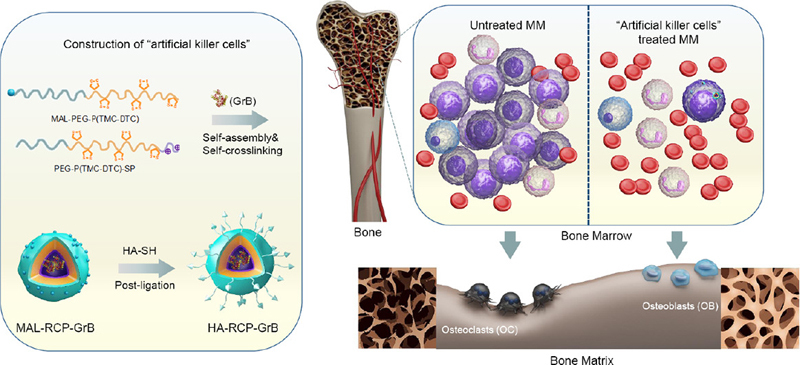 Multiple myeloma (MM) is a malignant blood cancer homing in bone marrow that is particularly hard to treat. The effective treatment for MM shall be not only MM-selective but also capable of homing to bone marrow. Herein, we report on hyaluronic acid-directed reduction-responsive chimaeric polymersomes encapsulating a key player in the NK cells, granzyme B (HA-RCP-GrB) as an artificial killer cell for targeted protein therapy of MM. Interestingly, HA-RCP-GrB displayed high MM-targetability and anti-MM activity with a remarkably low IC50 of 8.1 nM toward CD44 overexpressing LP1 human MM cells. The in vivo biodistribution studies using Cy5-labeled cytochrome C as a model protein demonstrated significantly enhanced accumulation of HA-RCP in the subcutaneous LP1 tumor as well as in the bone marrow of orthotopic LP1 MM model compared with the non-targeted RCP counterparts, confirming that HA-RCP possesses MM-selectivity and is able to deliver proteins to the bone marrow. In accordance, HA-RCP-GrB exerted significantly better suppression of subcutaneous LP1 tumor than the non-targeted RCP-GrB. More interestingly, in the orthotopic LP1 MM-bearing mice, HA-RCP-GrB led to significant survival benefits and less body weight loss over PBS and RCP-GrB. μCT analyses, H&E and TRAP staining revealed that mice treated with HA-RCP-GrB had greatly reduced osteolysis and proliferation of atypical plasma cells in the bone marrow. HA-RCP-GrB has emerged as a novel and effective treatment for multiple myeloma.