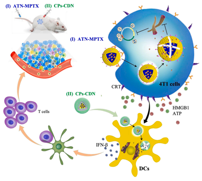 Triple negative breast cancer (TNBC) with easy metastasis, “cold” tumor immune microenvironment, and lack of targeted therapy remains poorly prognosed. Chemo-immunotherapy deemed as a potential treatment for TNBC is however confronted by low TNBC selectivity, pronounced systemic toxicity, and limited immunogenic cell death (ICD) induction. Here, employing clinically validated ATN peptide as a ligand and reduction-sensitive biode[1]gradable micelles as a vehicle we constructed α5β1 integrin-targeted micellar paclitaxel (ATN-MPTX) to elicit strong and selective ICD and chemo-immunotherapy of TNBC. ATN-MPTX exhibited evident targetability and prominent uptake in α5β1 integrin-positive 4 T1 cells and induced significantly stronger ICD than free PTX and non-targeted MPTX. The therapeutic studies in 4 T1 TNBC model demonstrated that ATN-MPTX caused superior tumor accumulation and treatment efficacy to all controls. Of note, ATN-MPTX plus nano-STING agonist further augmented the immunotherapeutic effects by increasing secretion of proinflammatory cytokines and CD4+ and CD8+ T cells in the tumor and spleen while reducing Treg, leading to significantly improved inhibition of 4 T1 primary tumor and more interestingly mitigated lung metastases. This strong and selective ICD induction of ATN[1]MPTX renders it an interesting tool to enhance chemo-immunotherapy of TNBC.